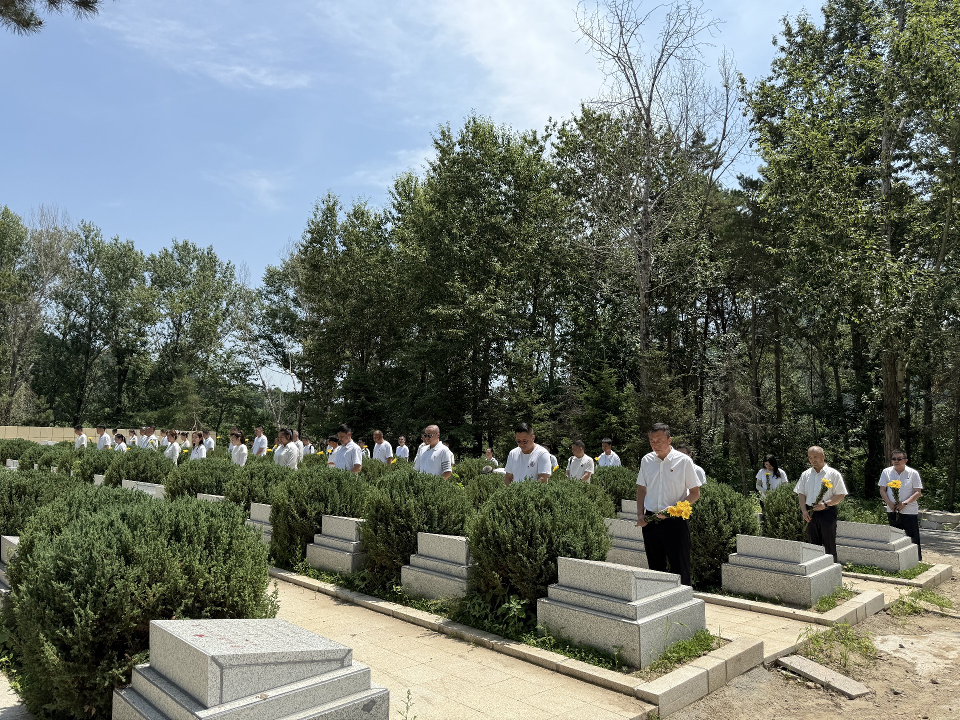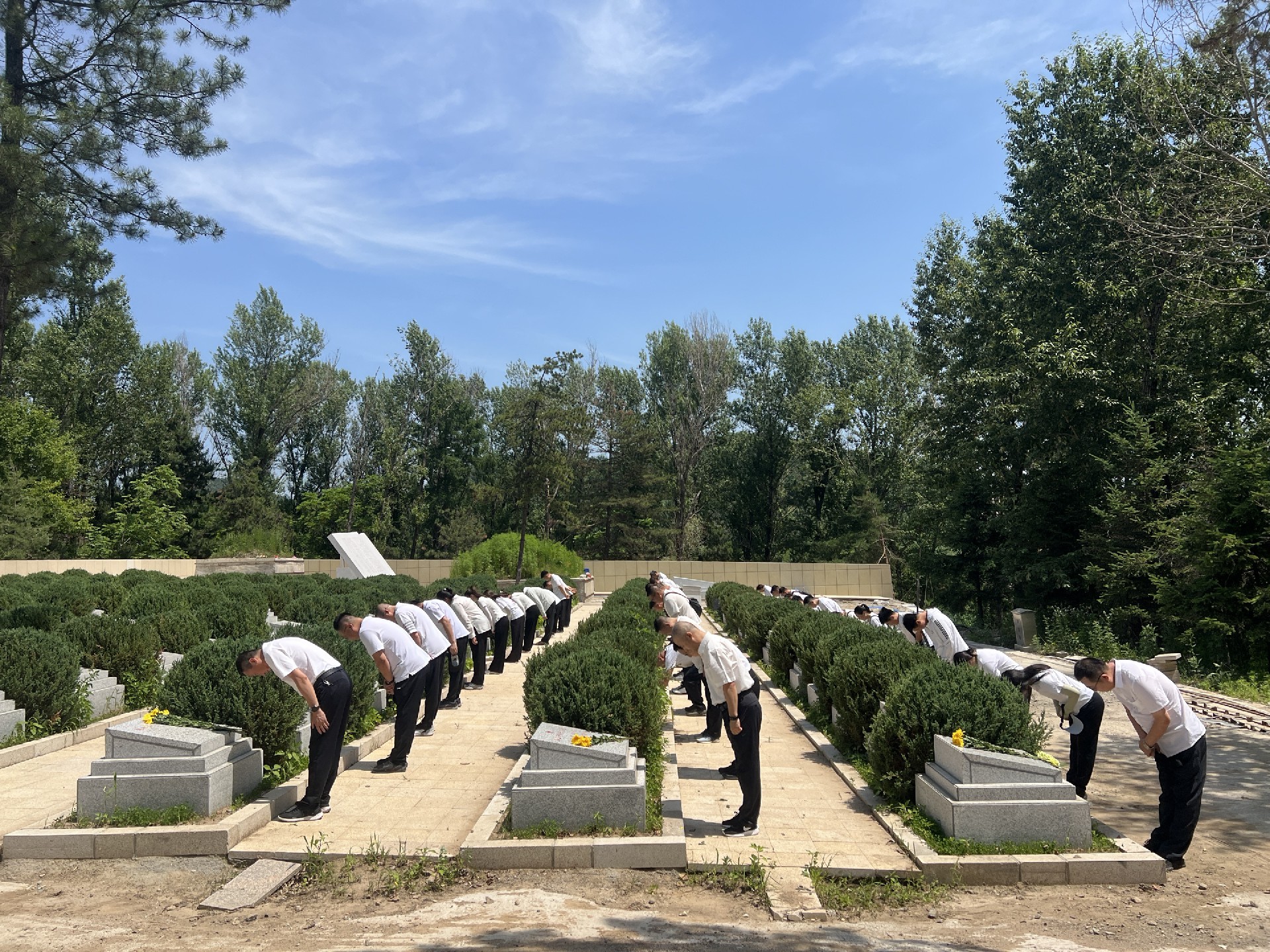 炎炎烈日下,革命烈士墓园庄严肃穆,松柏苍翠。同志们列队整齐,神情凝重,凝望着烈士墓碑。聆听讲解员讲述英烈们故事,仿佛置身于那段峥嵘岁月,深切感受革命先烈为民族独立、人民解放抛头颅洒热血的伟大精神。随后,大家向墓碑默哀、献花,表达对先烈的崇高敬意与无限缅怀。