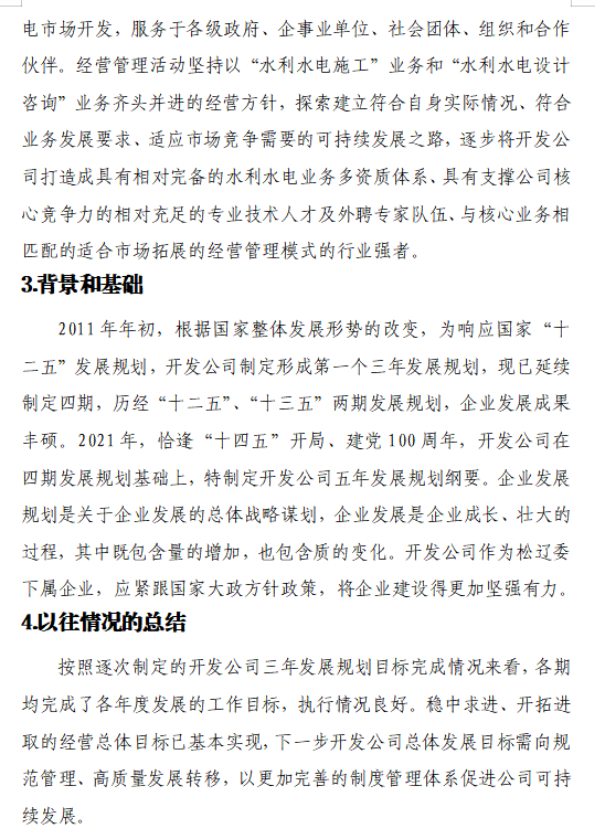 2021年,恰逢“十四五”开局、建党100周年,开发公司以规范管理、高质量发展为总原则,进一步找准水利改革发展方位,探索建立符合自身实际情况、符合业务发展要求、适应市场竞争需要的可持续发展之路。在客观公正评价评估公司内外基础和相关因素的基础上,结合国家制定的行业发展战略和公司参与的主要市场区域特点,充分分析公司2017~2019、2020~2022年发展规划,找准公司生存之本,在以往四期发展规划基础上,特制定《开发公司2021~2025年发展规划纲要》。《纲要》明晰2021~2025年公司发展的经营管理思路,分析公司发展的有利因素及存在的主要问题,提出适合公司持续发展的保障措施,为公司健康可持续发展提供了重要依据。