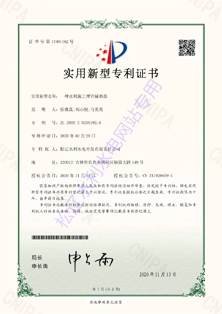 “一种水利施工埋管辅助器”实用新型专利证书